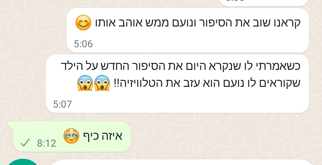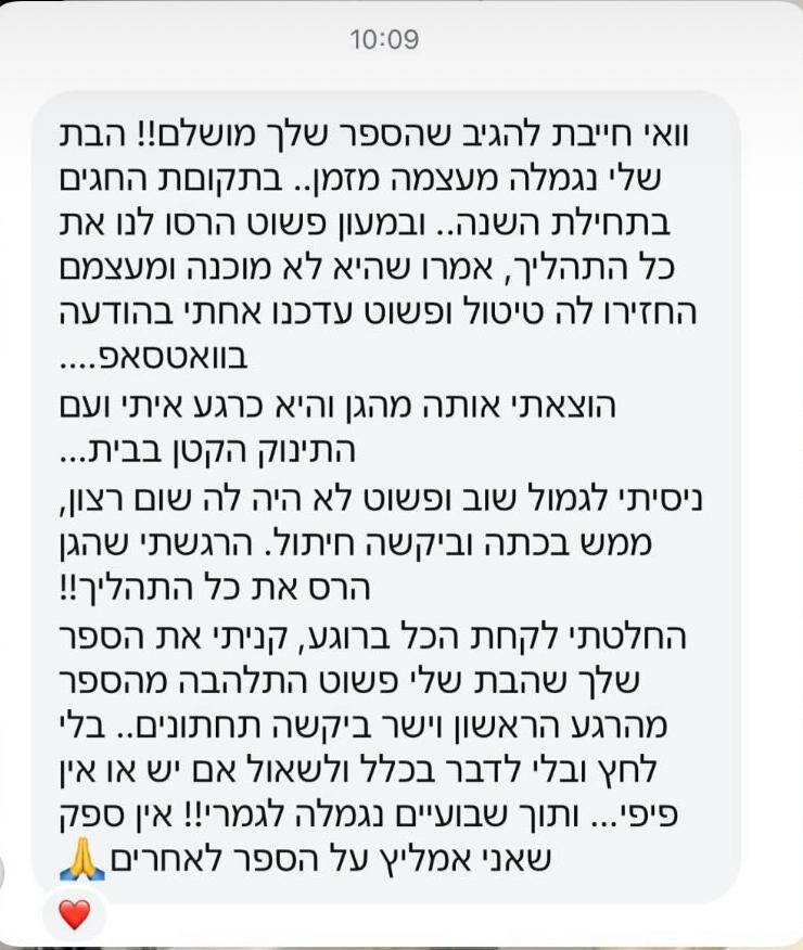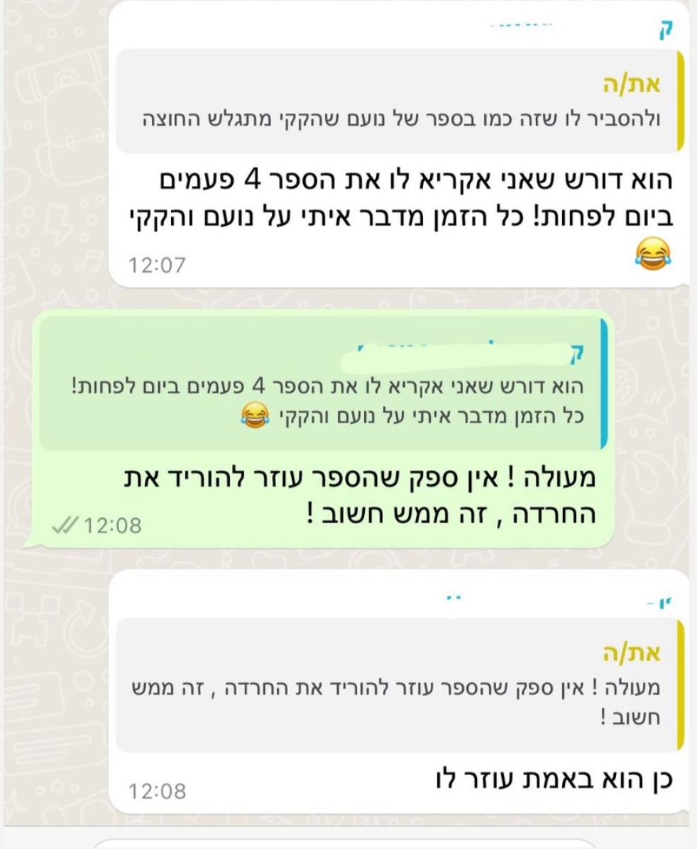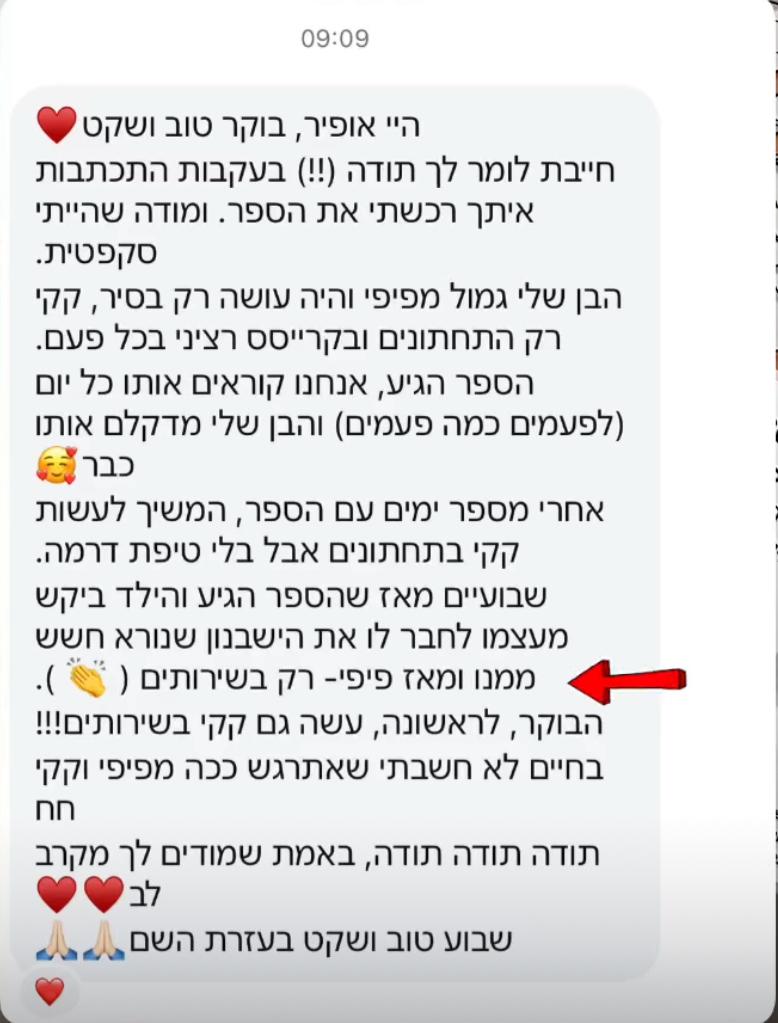 ברוב המקרים כבר מהקריאה הראשונה רואים שמשהו נרגע ומתחיל להתחבר לילד. לא כי הכול נפתר בבת אחת, אלא כי הוא סוף־סוף מבין מה קורה לו בגוף. מכאן זה תהליך. כל קריאה מחזקת עוד קצת את ההבנה, עוד קצת את הביטחון, ובהדרגה הדברים מתחילים לזוז. בלי הבטחות קסם, בלי לחץ – פשוט התקדמות טבעית בקצב של הילד.