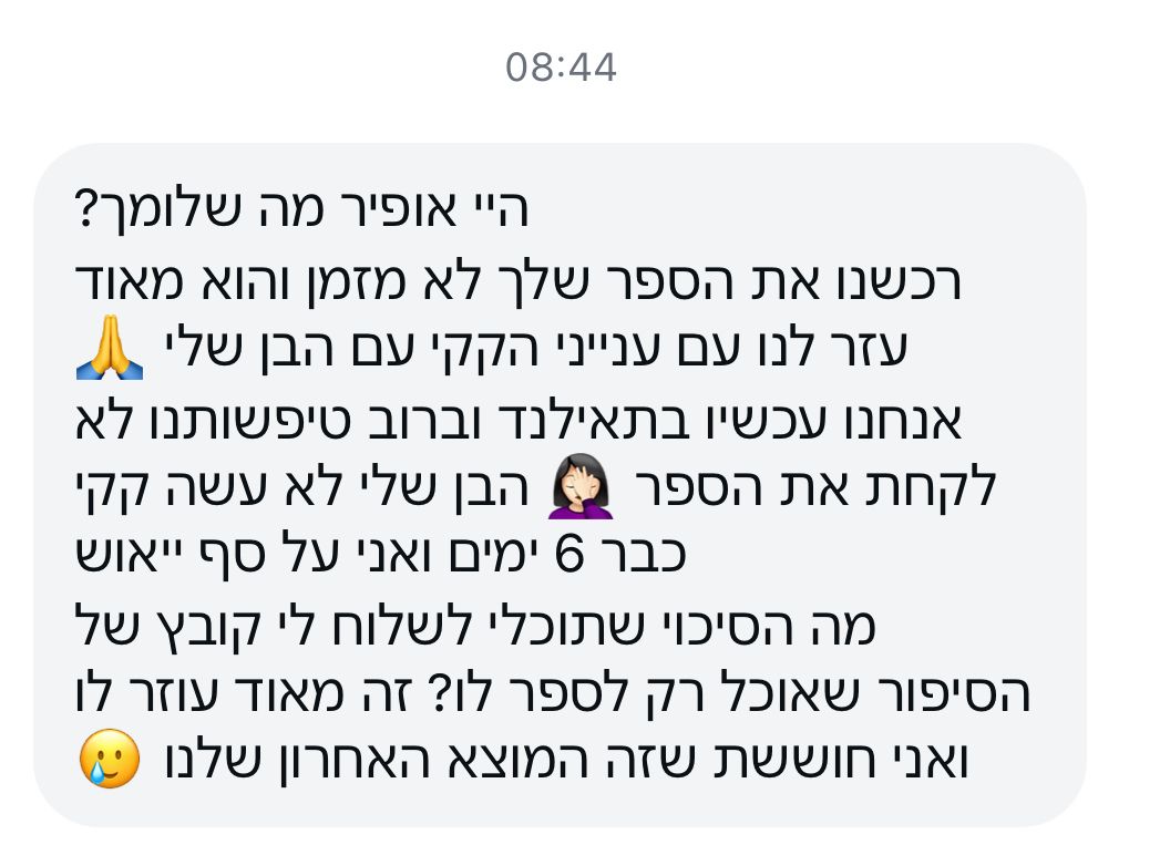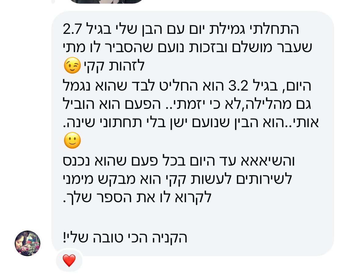 הספר לא בא לכפות גמילה ולא לדחוף תהליך, אלא לתת לילד שפה והבנה למה שקורה בגוף שלו. ברגע שיש הבנה, אפשר להתחיל תהליך בצורה בטוחה, רגועה ובהתאם לקצב של הילד, גם אם עוד יש חיתול וגם אם עוד לא התחלתם גמילה רשמית.
